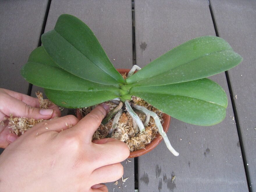 新しい根の先端はとがって緑色をしていますが、それ以外は白く太って植え込み資材に密着するようになります。