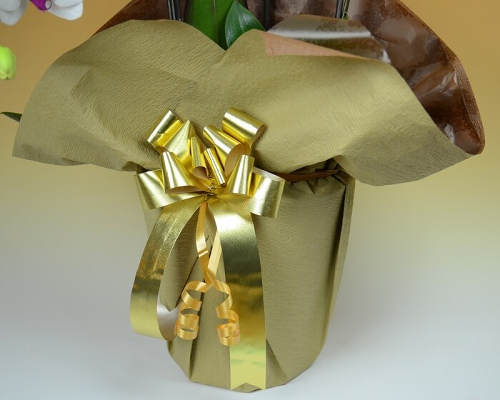 お祝いの贈答品です。胡蝶蘭にはラッピングをして贈りましょう。