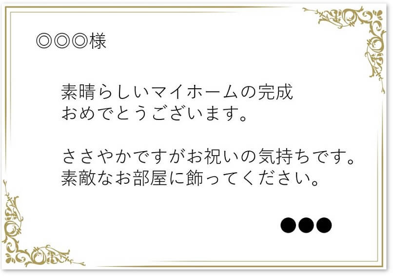 「新築おめでとうございます。新居での生活が笑顔であふれるものとなりますように。」