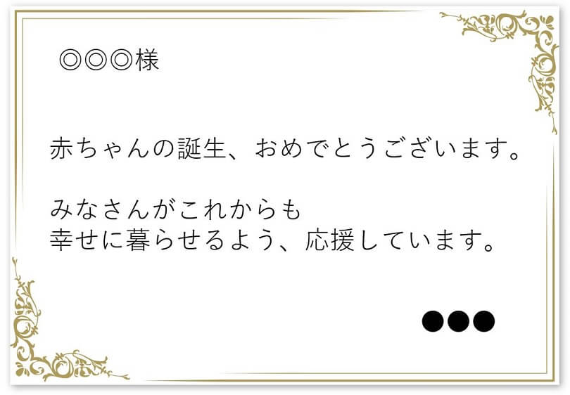 「ご出産おめでとうございます。○○ちゃんの健やかな成長をお祈りいたします。」などがあります。