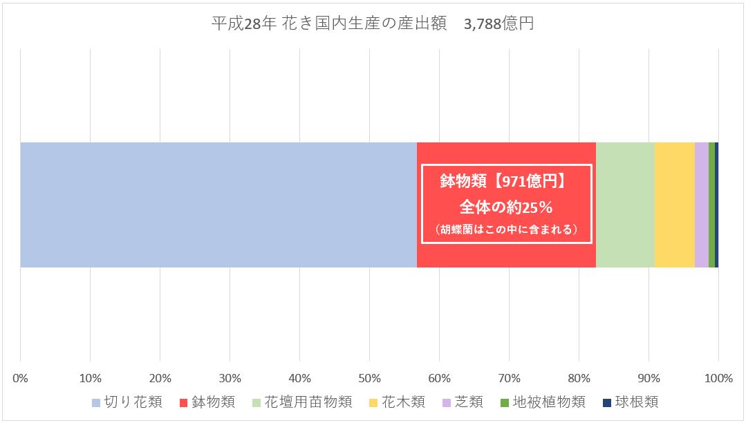 そこで今回は、花き業界をひも解いていくとともに、業界における胡蝶蘭のポジションを紹介したいと思います。