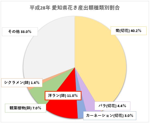 ※ 愛知県は、全国の花き産出額ランキングで、菊1位、バラ1位、洋ラン1位、カーネーション2位、シクラメン2位となっています。