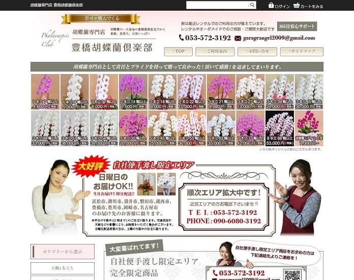 豊橋胡蝶蘭倶楽部![]() | 1日1鉢限定の割引商品があります。また、愛知県東部・静岡県西部を中心に、自社便の手渡し配送をエリア限定で行っています。 |