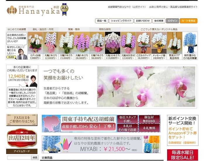 胡蝶蘭専門店はなやか![]() | 大輪、ミディの定番商品に加え、オリジナル商品の豊富さ、ラッピングや立札の種類の豊富さ、サービスの充実度は他の通販よりも優れています。 | 紹介ページ |