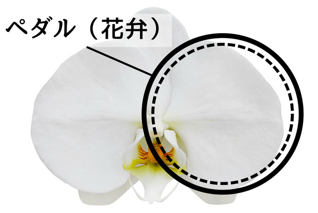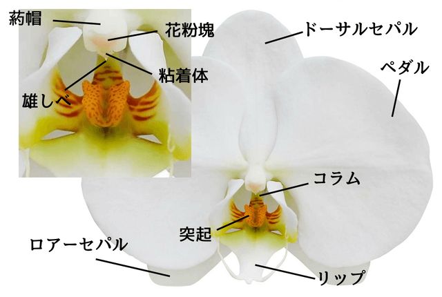 胡蝶蘭の花は3枚の花弁と3枚のがく弁で構成されています。花は左右対称になっており、花弁は2枚のペダル・1枚のリップ、がく弁は1枚のドーサルセパル・2枚のロアーセパルで構成されています。