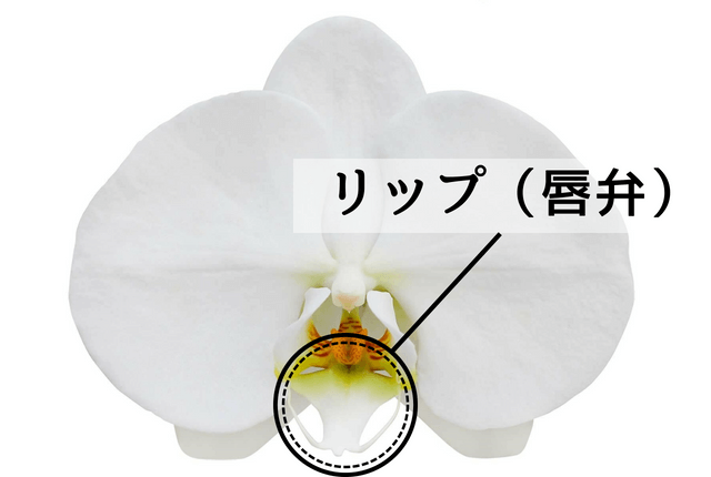 ペダル(花弁) 左右に大きく広がる半円型のペダルは、観賞価値が高く、大きなものの方が豪華で高値になります。 | リップ(唇弁) 先端は細く尖っていています。昆虫の着地点になる役目を果たします。 |
