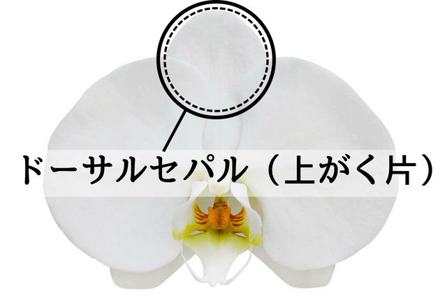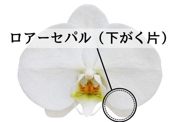 ドーサルセパル(上がく片) ドーサルセパルはリップと反対側の上に1枚付きます。ドーサルとは背・背面という意味です。 | ロアーセパル(下がく片) ロアーセパルはリップの真後ろである花の下に左右1枚ずつ付きます。 |