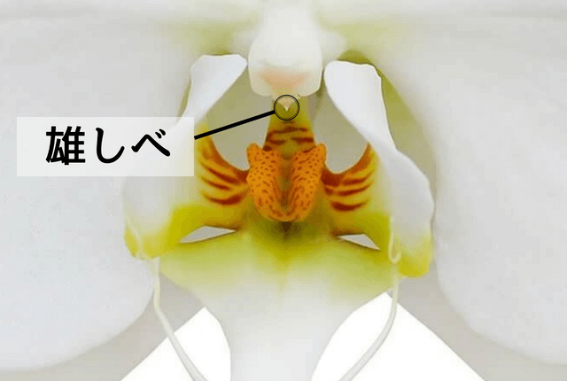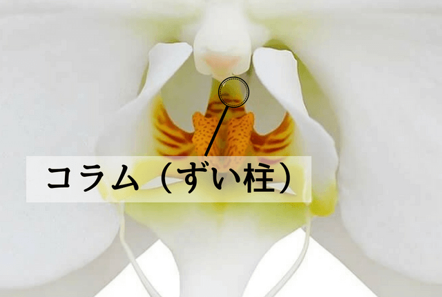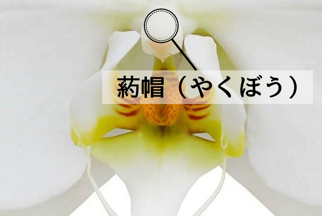 葯帽(やくぼう) コラムの先の方についており、花粉塊を包む役割をしています。 | コラム(ずい柱) リップの奥の方にあり、先端の方に雄しべと雌しべに相当する器官(花粉塊)がついています。 |