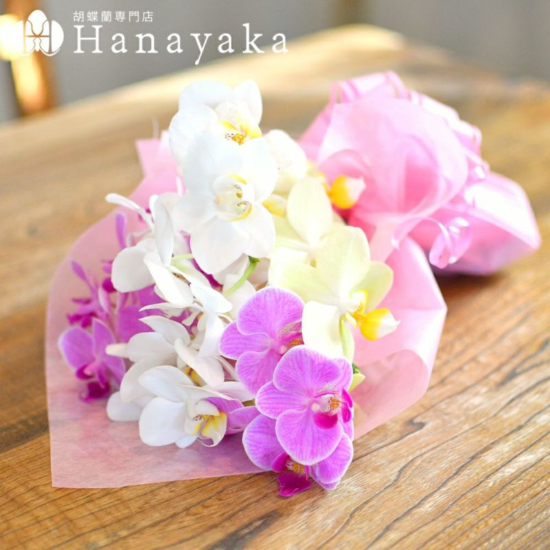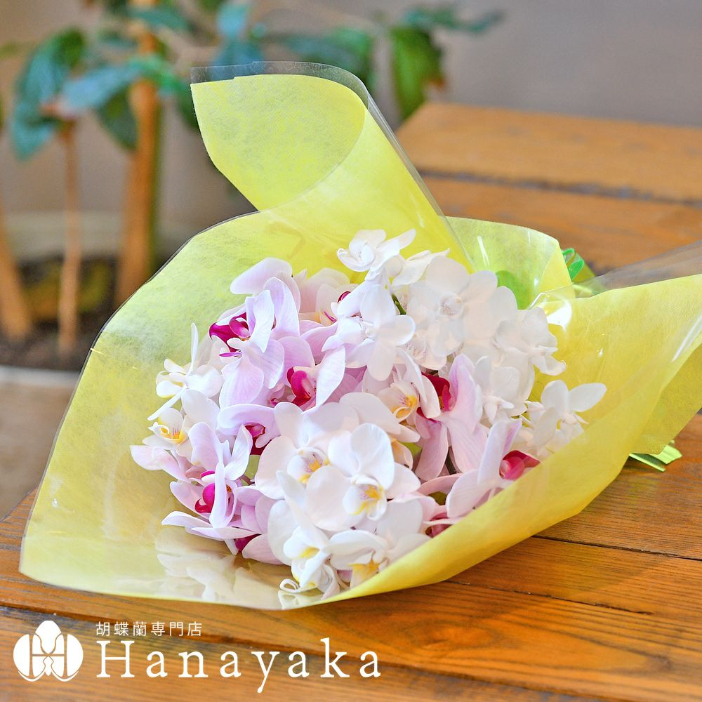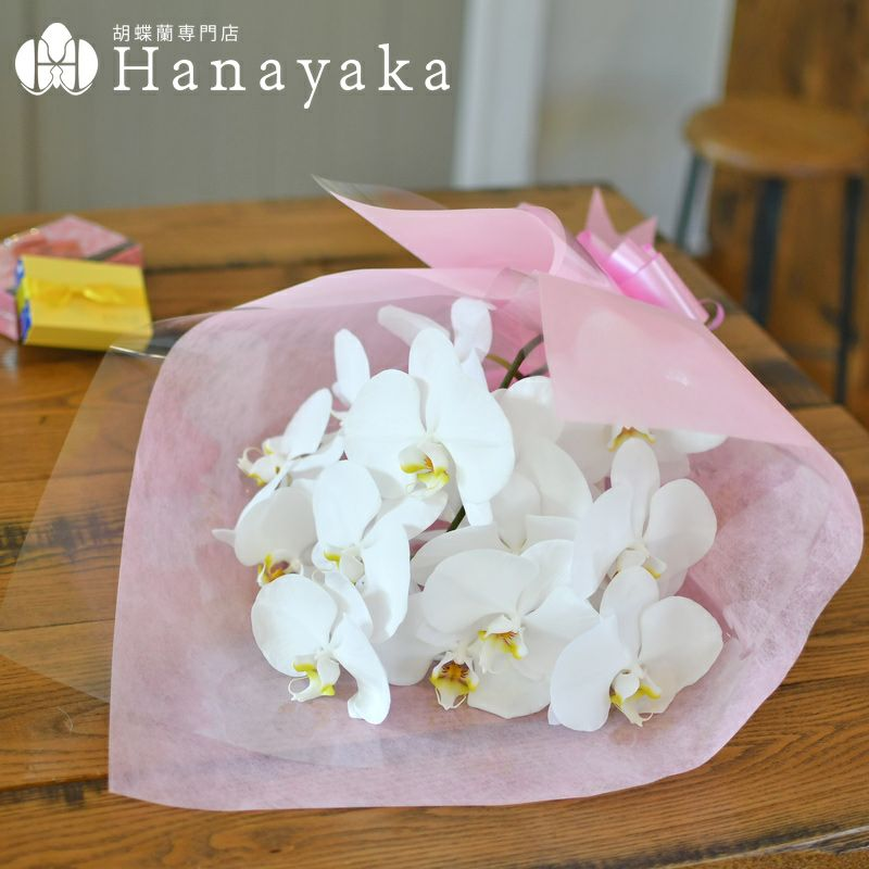 胡蝶蘭大輪3本~5本の花束です。白一色の品であり、一際目を引く花束です。