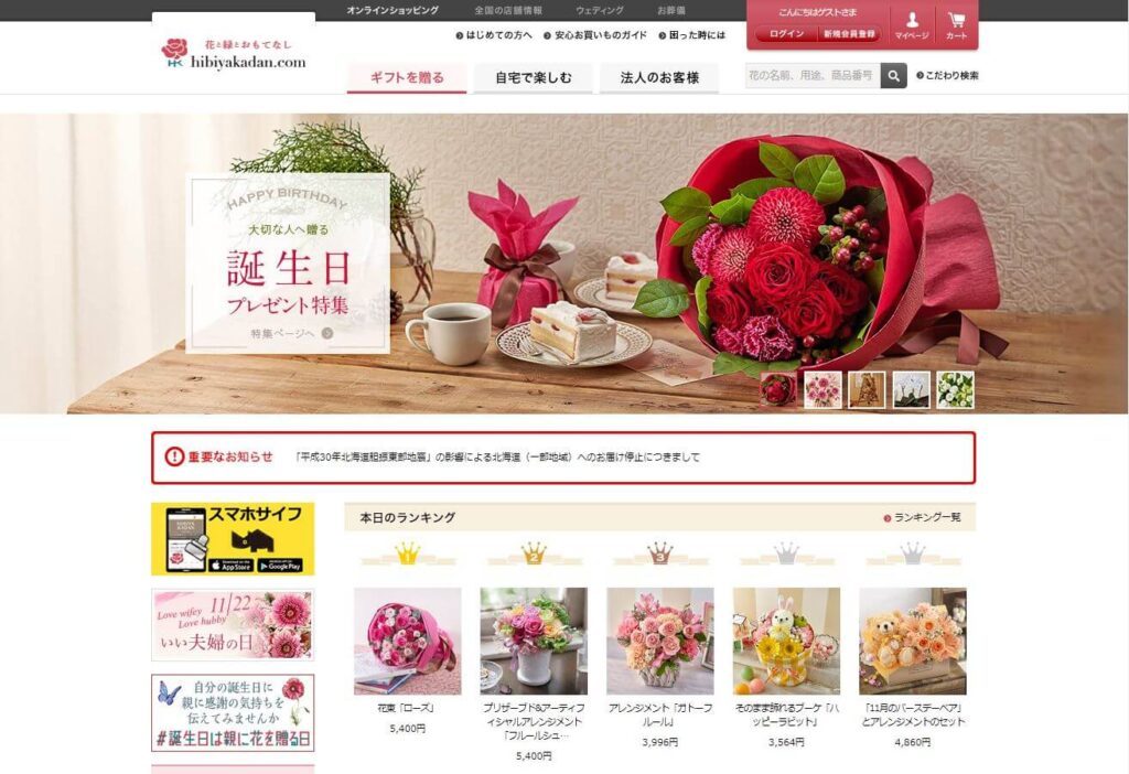 日比谷花壇のオンラインショップを見てみると、「ギフトを贈る」「自宅で楽しむ」「法人のお客様」と、カテゴリが分かれており、選ぶ人や目的によって分かれているので、購入者も選びやすくなっています。