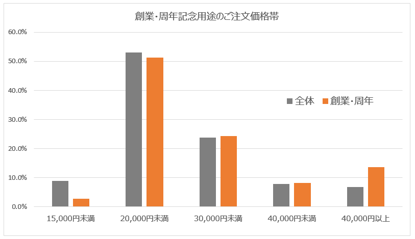 このことから、上記グラフの「全体」にも企業・団体のお祝い目的が含まれていると思われますので、これを市場一般の「全体」として、創業・創立・周年・上場を記念した用途の胡蝶蘭と比べてみると、さらに顕著な差があるかもしれません。