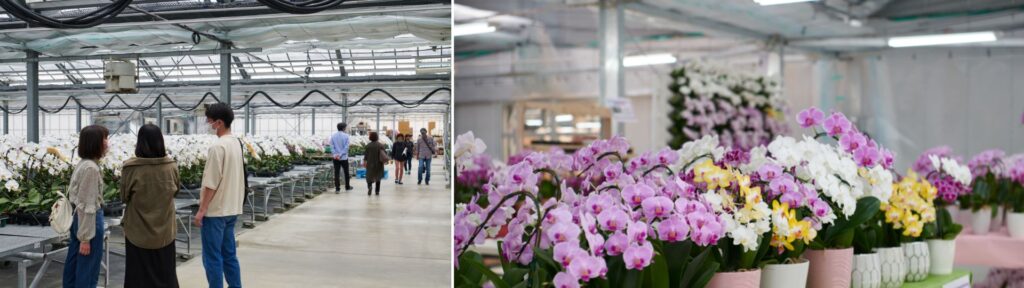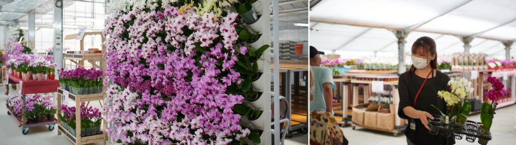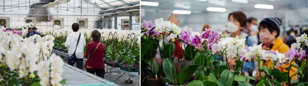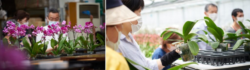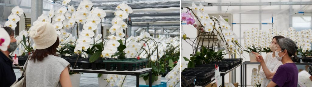 胡蝶蘭は3ヶ月、手間暇をかけ仕立てられる。ただ、生物でもある為、注文の時期を逃してしまった物の行先は今のところない。一つでもお客様に、もっと言えば、愛でてくださる方のもとへ 送り出してあげたいとつぶやいたスタッフさんの一言が印象的であり、生産者さんの愛情を感じる瞬間だった。
